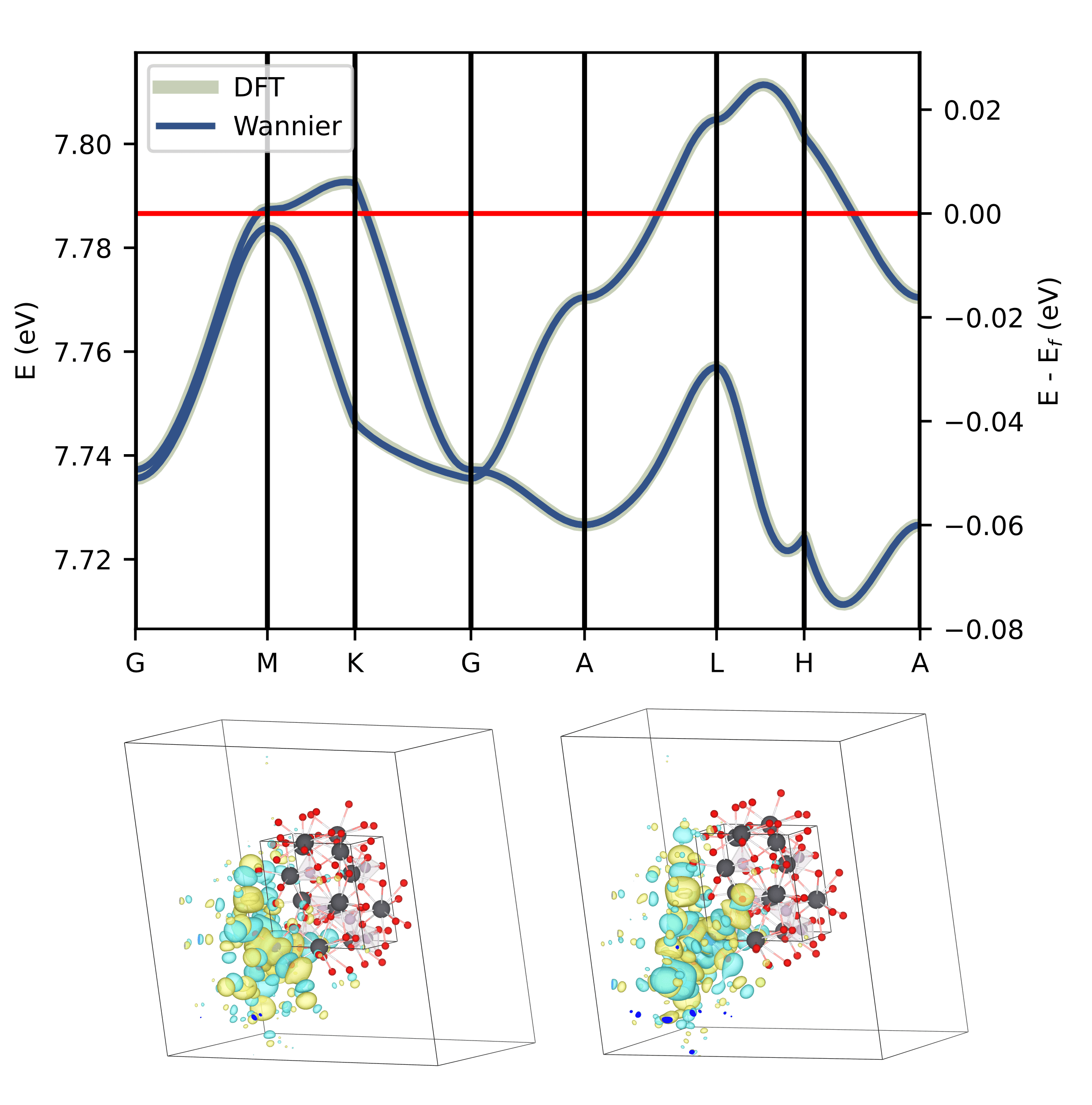 Figure 3: Band Structure of the active space, with real space image of Wannier functions obtained to describe these bands.